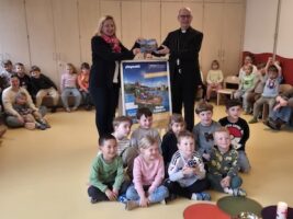 Dr. Franz Jung überreicht den Kindern ein Playmobil-Set mit den Frankenaposteln Kilian, Kolonat und Totnan.
